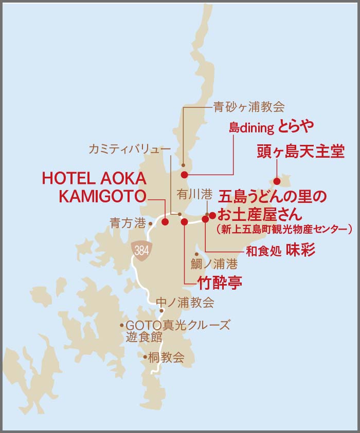 東シナ海に浮かぶ九州最西端の島々・五島列島の北部に位置する新上五島町。5つの地区からなるこの町には、荒々しい岩肌と緑のコントラストに、入り江ごとに異なる表情を見せる青い海と、心踊るような美しい景色が広がっている。そんな島々の魅力を体感できるのが、クルージングや星空ツアー、教会巡りなどの多彩なアクティビティー。また、名物の「五島うどん」や「五島牛」のほか、鮮魚料理に郷土料理の「かっとっぽ」「かんころもち」も外せない。