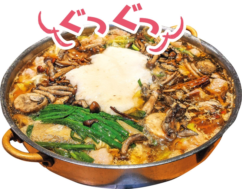 乾杯の『西の星』ハイボールが、藁焼まぐろの美味しさを爽やかに後押ししたら、メイン料理は自慢の「あごだしもつ鍋」。国産牛の小腸をあごだし醤油のスープでくつくつ、自家製辛ニンニクがアクセント!きのこと山芋もたっぷりインして秋の味覚も満喫ー。