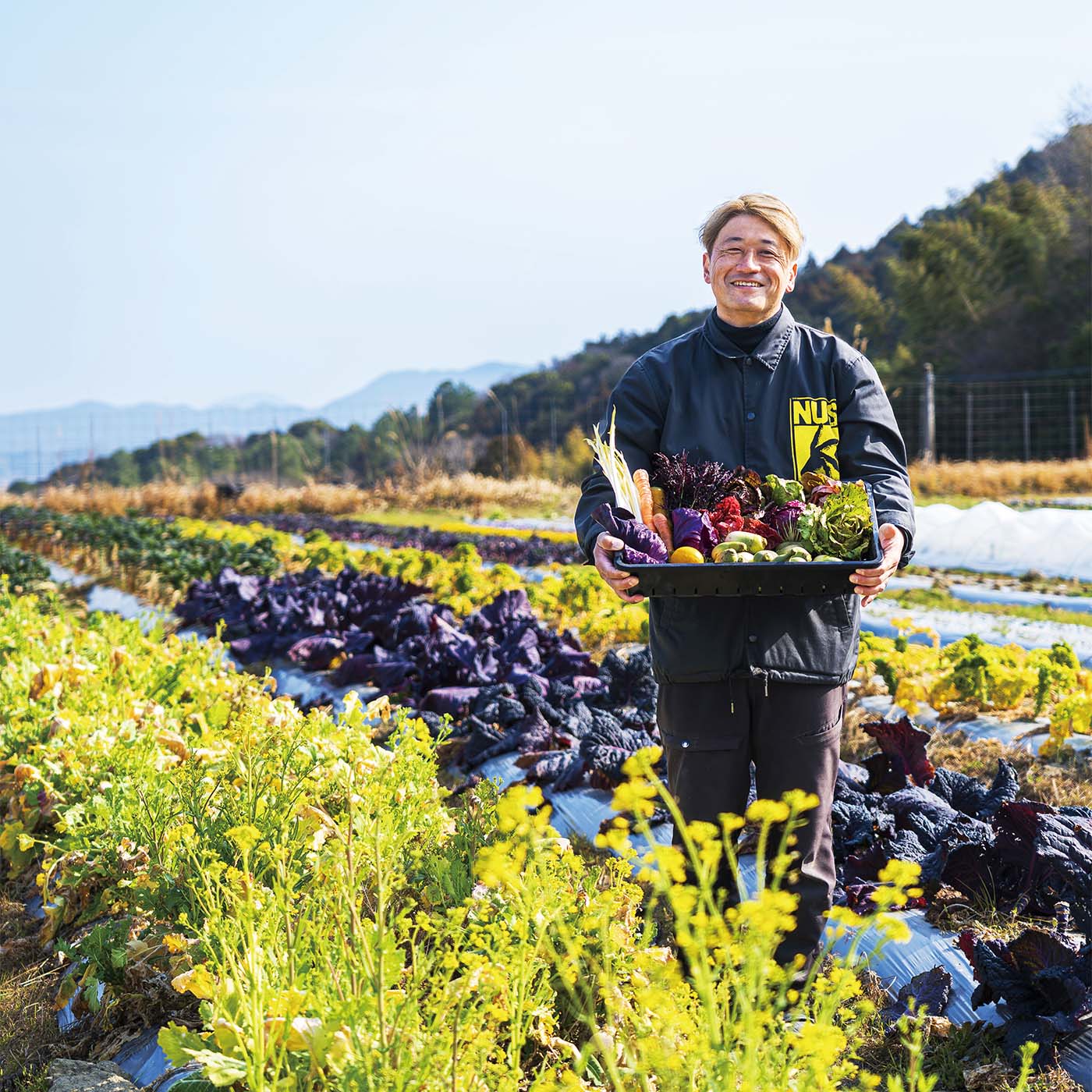 『ノガミファーム』の畑があるのは、桂川町と飯塚市にまたがる弥山岳の麓。鳥のさえずりが心地よいこの地で、野上伸太郎さんと妻・奈津枝さんは、合わせて10haの田畑で無農薬の野菜やハーブ、エディブルフラワー、そして減農薬米の栽培に日々勤しんでいる。