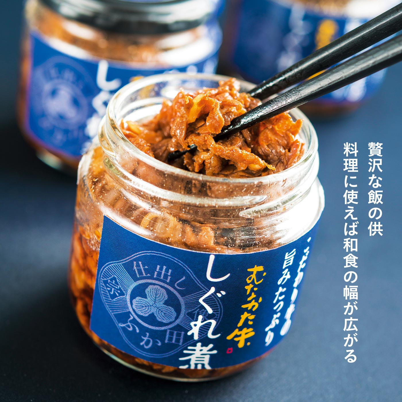 宗像の山海の幸を使った弁当やオードブルを展開する仕出し店。板前歴35年の店主・深田茂男さんが作る正統派の和食は、質実ながら肩肘張らない料理だ。「むなかた牛」を使った弁当が好評だったこともあり、具材であるしぐれ煮を瓶に詰めて長持ちさせようと考案したのがこの一品。牛丼、肉うどん、ピザ、サラダなどの具として活用すれば瞬時にお店クオリティに早変わり。牛肉らしいリッチな味わいながら、後味はしつこくない。醤油ベースの親しみやすい美味しさだ。