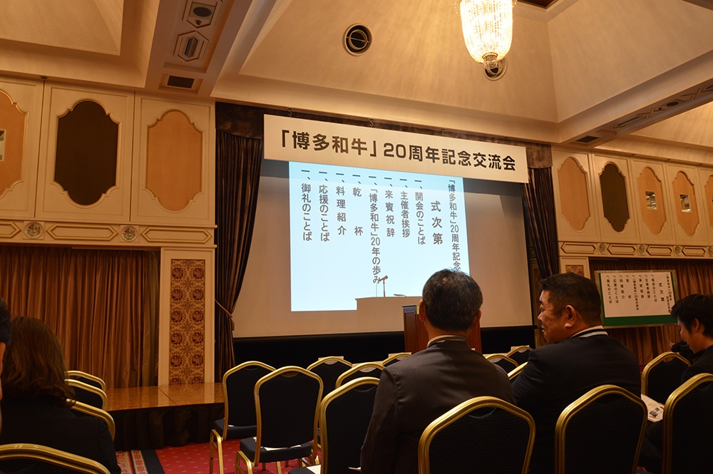 当日は、生産者、卸業者、外食関係者らをはじめ、福岡県の服部誠太郎知事、福岡県議会の藏内勇夫議長、博多和牛応援団長の中島浩二さんらも出席し、「博多和牛」20年の歩みを振り返る会となりました。