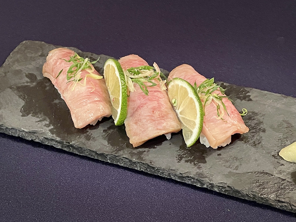 ▲博多和牛“三角バラ”炙り 桶盛り握り寿司