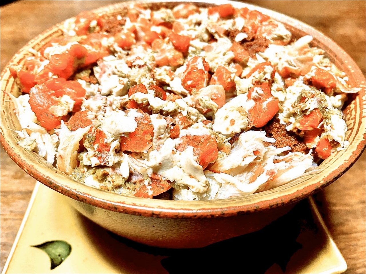 ゆでがにの身をほぐし、たっぷりのかに味噌をつけて・・・