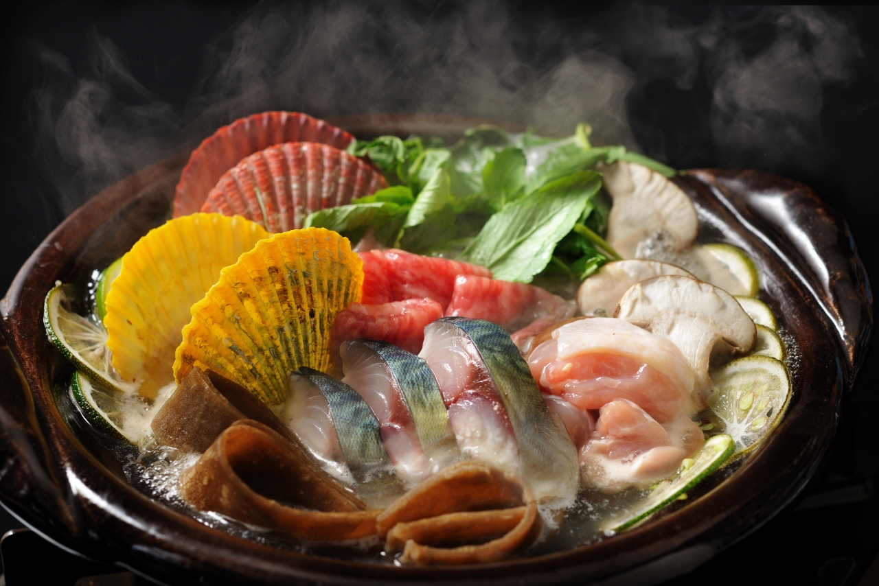 別府八湯にあわせて、ヒオウギ貝、豊後鯖、豊後牛、鶏肉、肉厚の椎茸、白菜、クレソン、椎茸の入っただんご麺という、8種類の食材が用意されています。